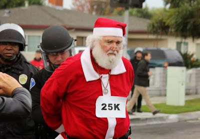 This is a picture of Santa (or possibly one of his helpers) being arrested for protesting outside of a Wal-Mart. People picketed Wal-Mart for paying their workers so little that they had to have food drives to help their own employees have a decent meal on Thanksgiving.